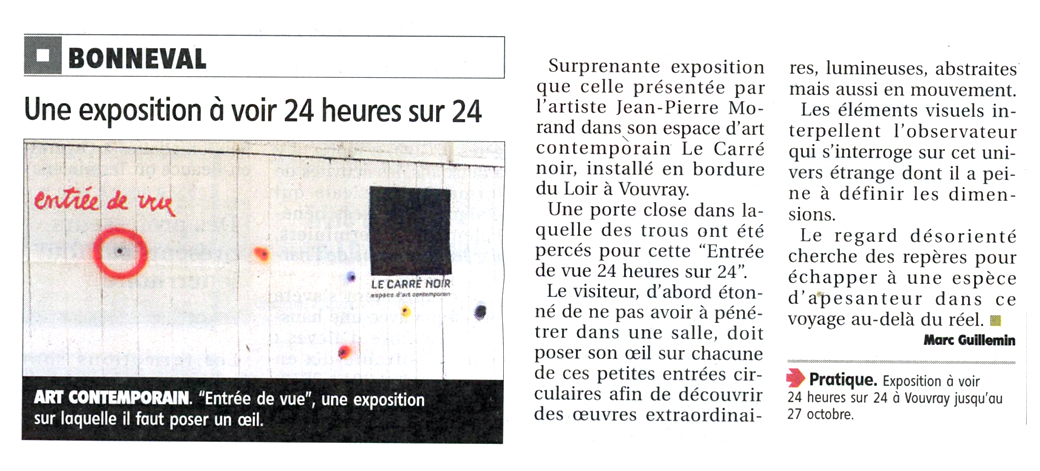 Une porte close dans laquelle des trous ont été percés pour cette « Entrée de vue 24 heures sur 24 ». Le visiteur, d’abord étonné de ne pas avoir à pénétrer dans une salle, doit poser son oeil sur chacune de ces petites entrées circulaires afin de découvrir des oeuvres extraordinaires, lumineuses, abstraites mais aussi en mouvement.
